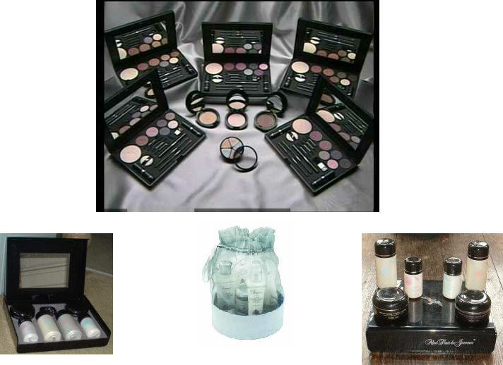A wide range of cosmetics including foundations, concealers, powders, blushers, eye shadows, mascaras, brow-fixed, eye pencils, lip pencils, lipsticks and lip glosses